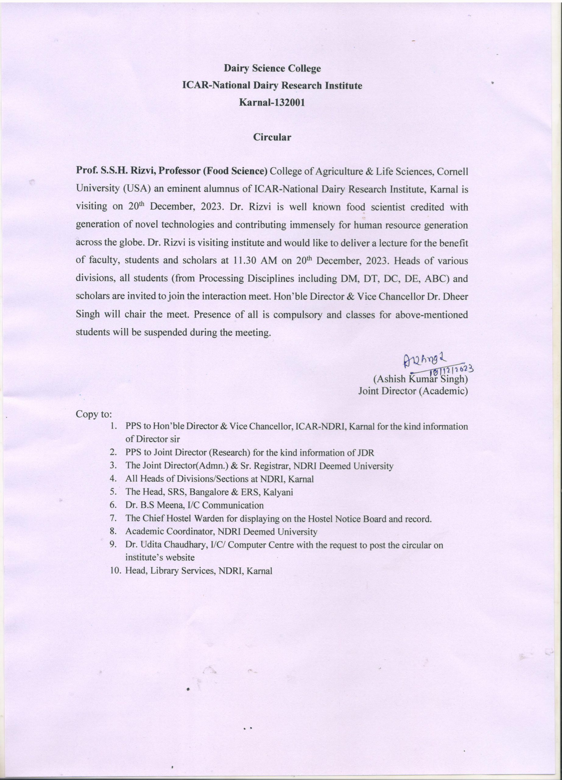 Circular regarding the Lecture by Dr. S.S.H. Rizvi, Professor (Food Science) College of Agriculture & Life Sciences, Cornell University (USA)